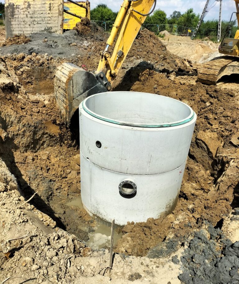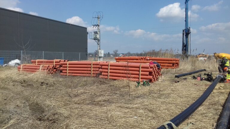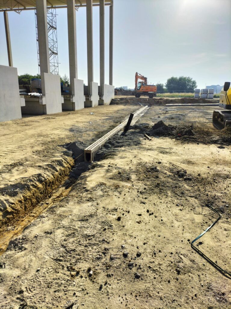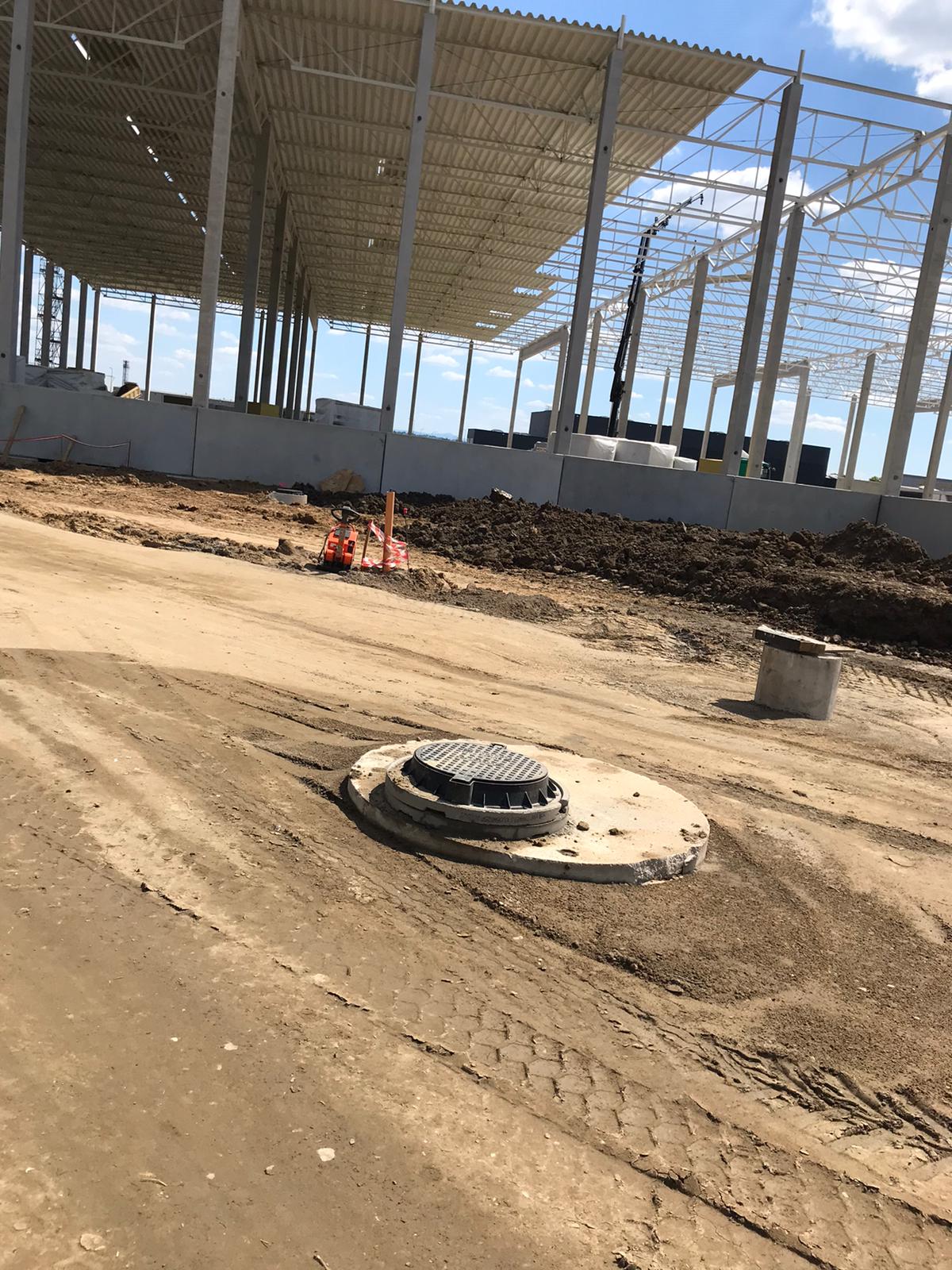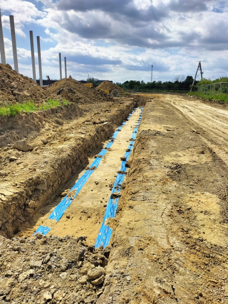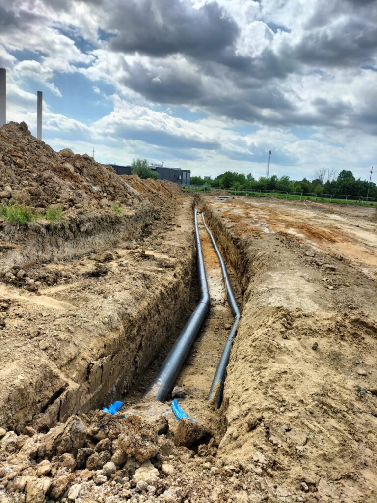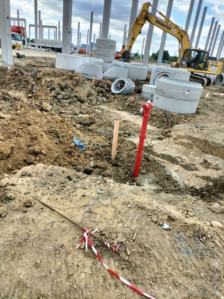 Zakres prac naszej firmy obejmował zewnętrzne instalacje sanitarne: kanalizację deszczową brudną, wodę bytową, instalację gazową, instalację wody przeciwpożarowej, kanalizację sanitarną oraz przebudowę rowów.