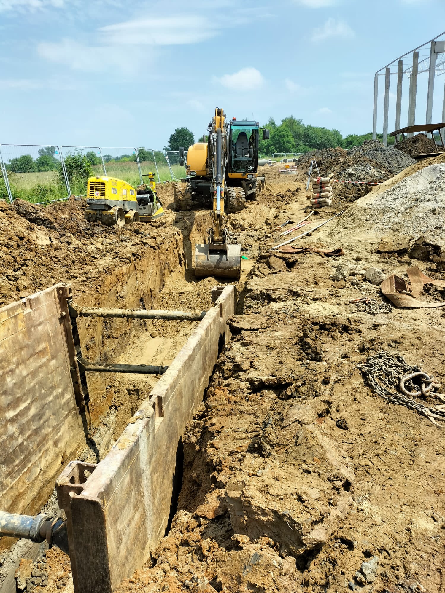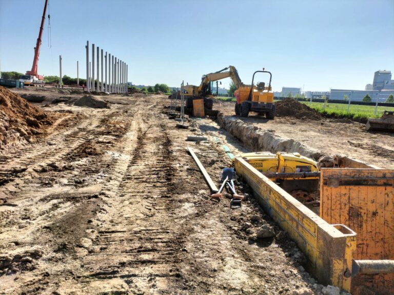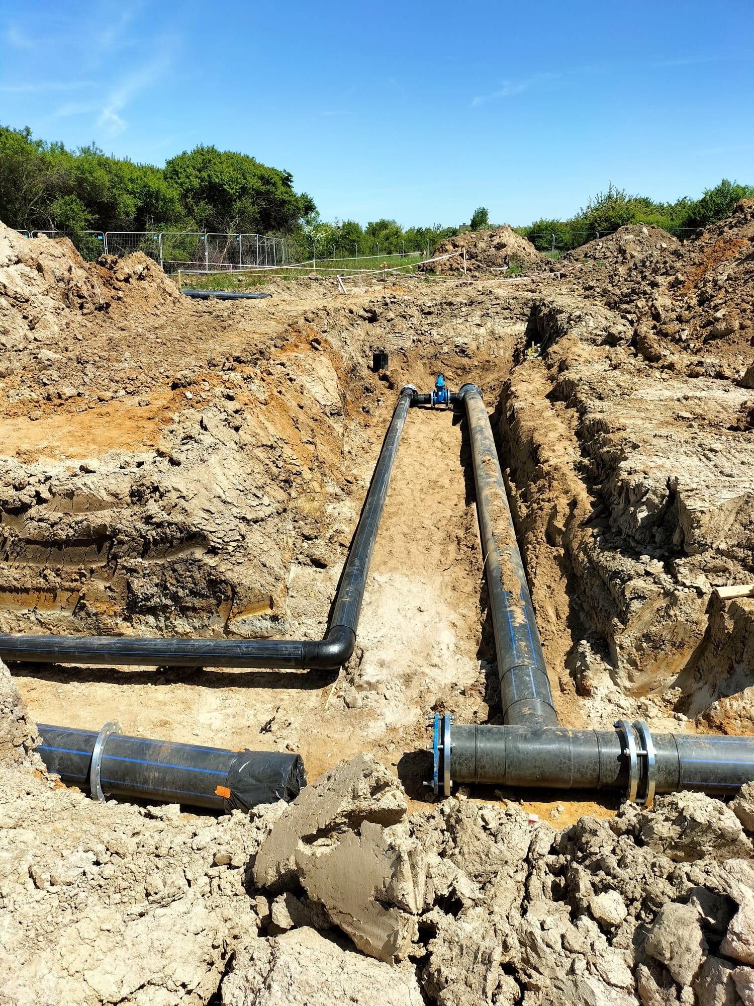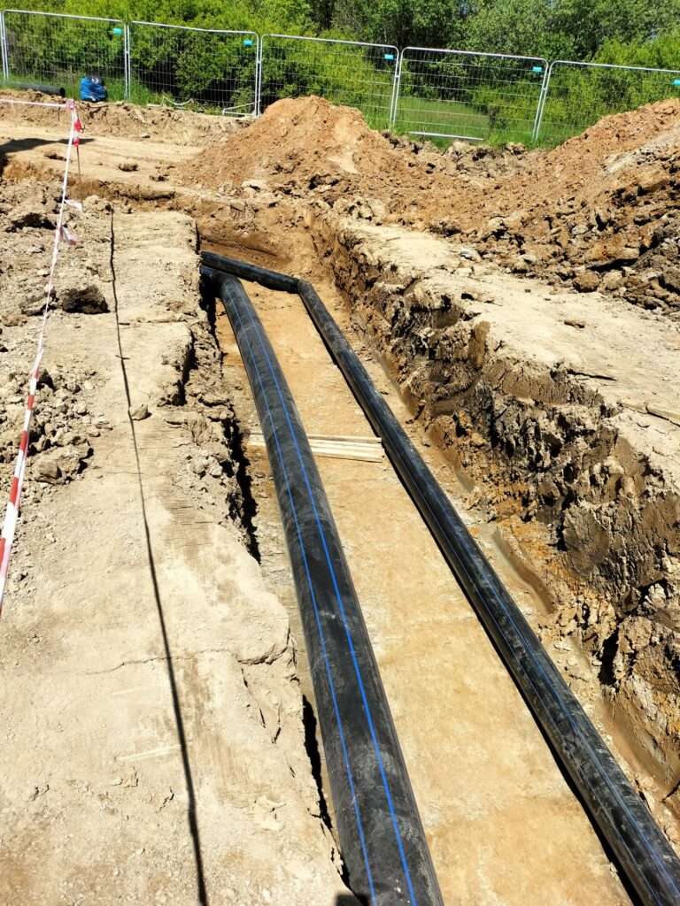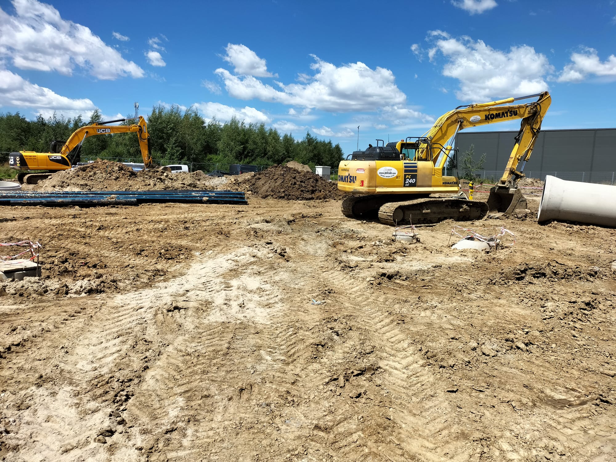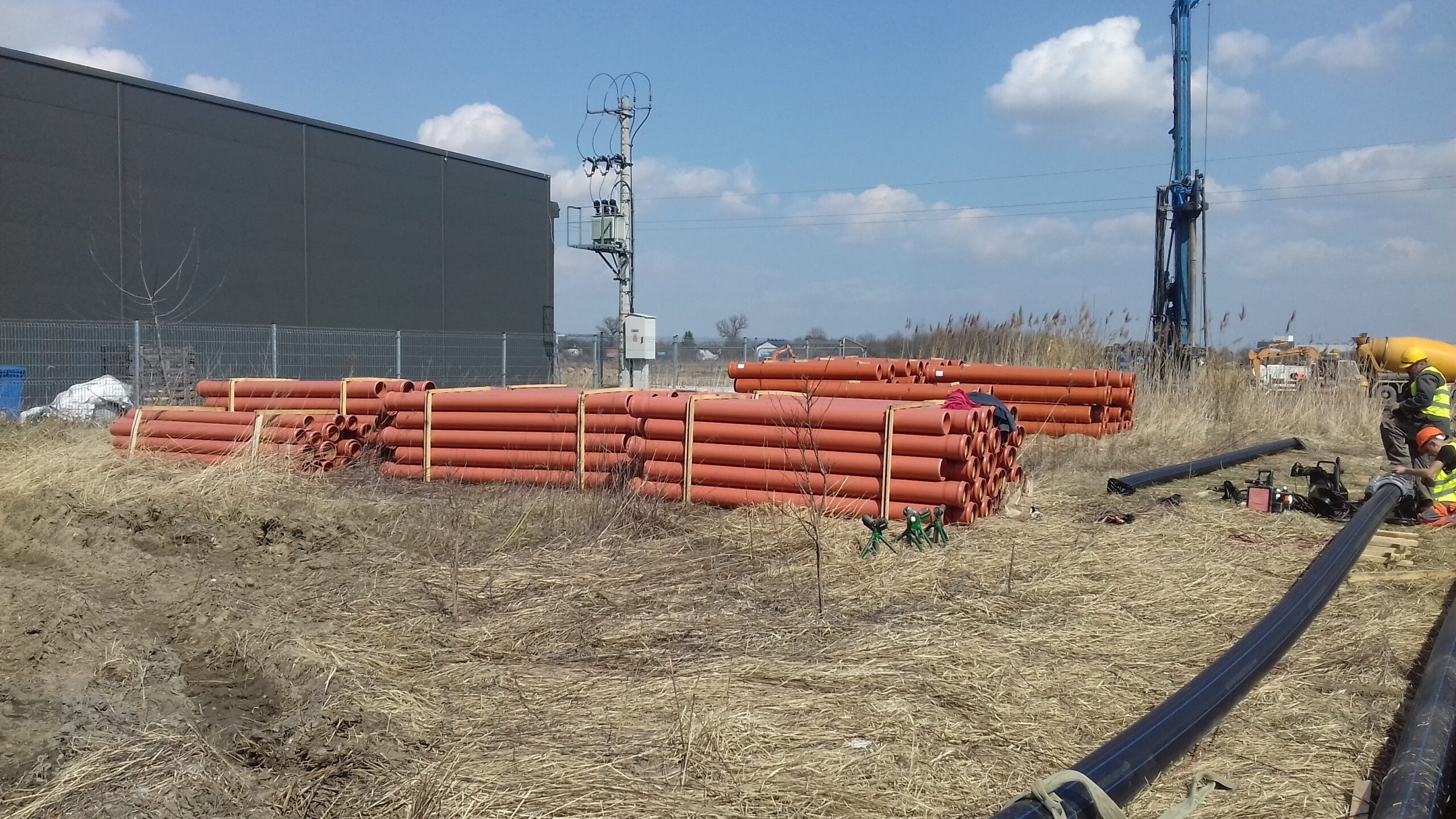 Zakres prac naszej firmy obejmował zewnętrzne instalacje sanitarne: kanalizację deszczową brudną, wodę bytową, instalację gazową, instalację wody przeciwpożarowej, kanalizację sanitarną oraz przebudowę rowów.